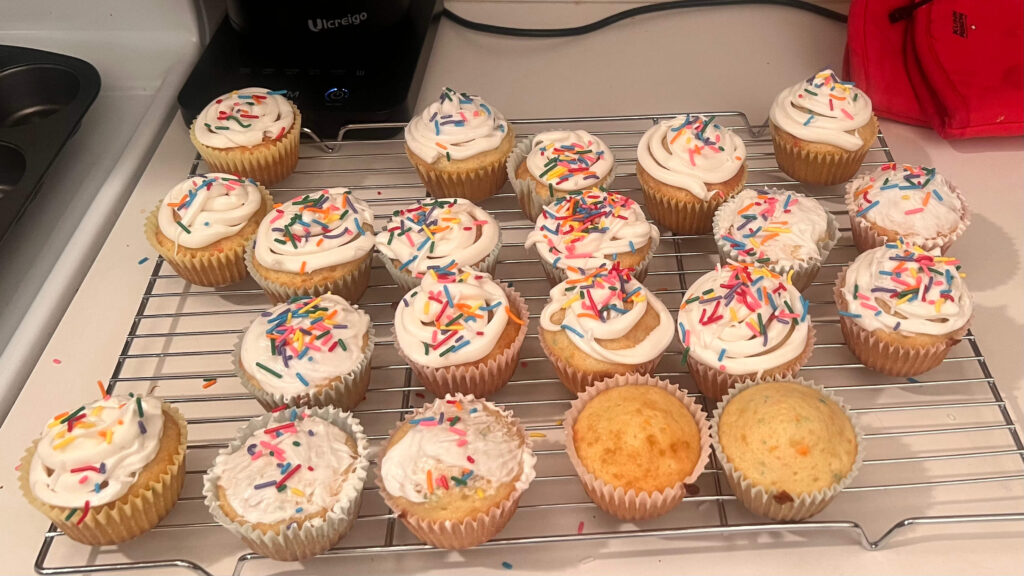 「今日は一日、気分がすごく落ち込んでいて(休みと思ったら出勤だったため)家に帰ってきてカップケーキを作れば、仲直りもできるし、自分の気分も晴れると思ったんだ。。。」と